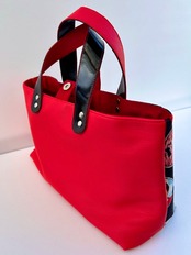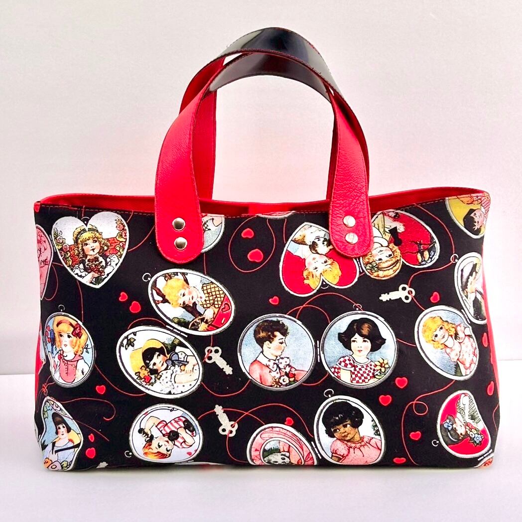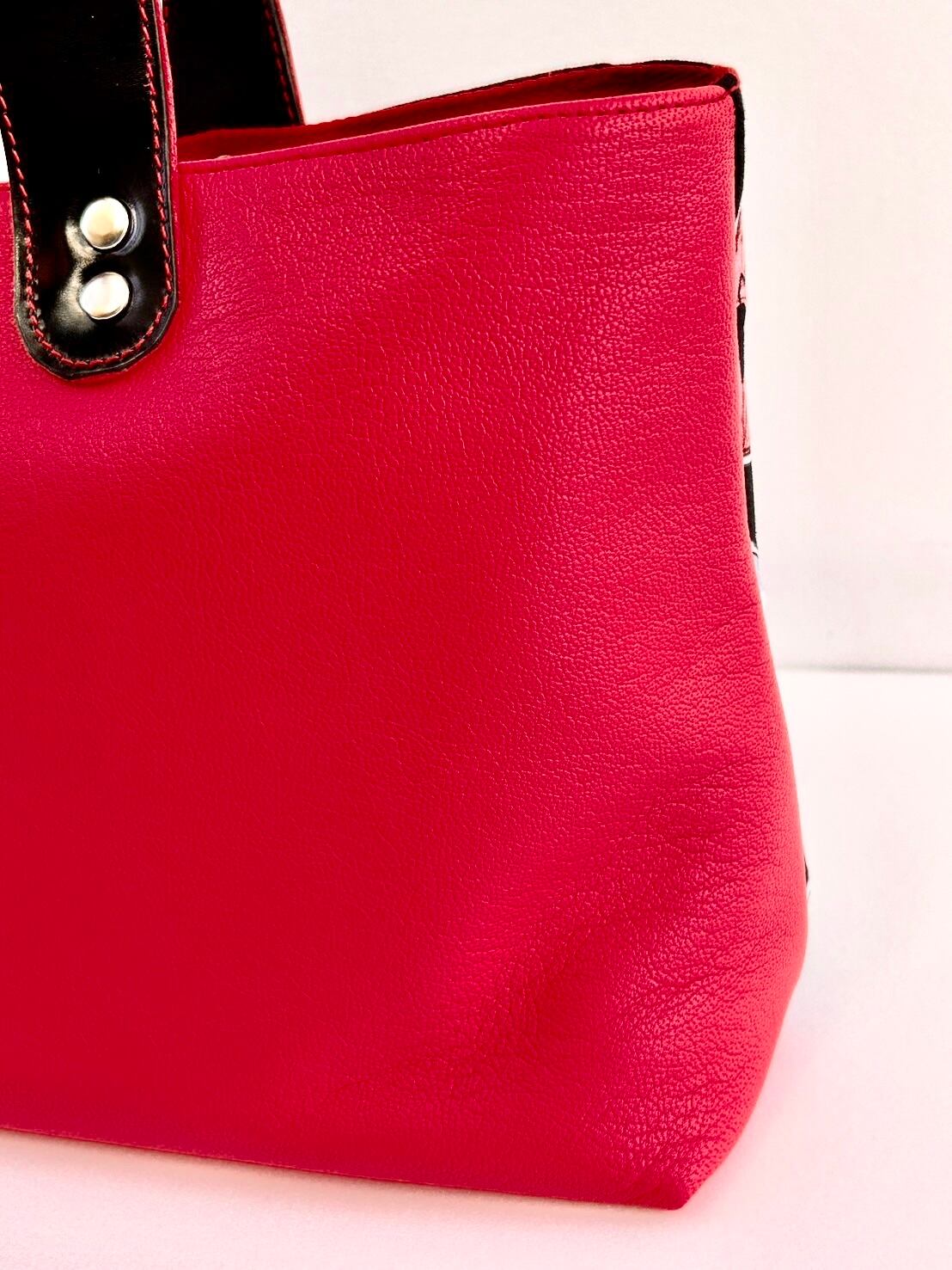 真っ赤なレザーがかわいいハンドバッグです。レトロな柄とシンプルレザーの組み合わせが個性的!お出かけしたくなる事間違いなしです♪