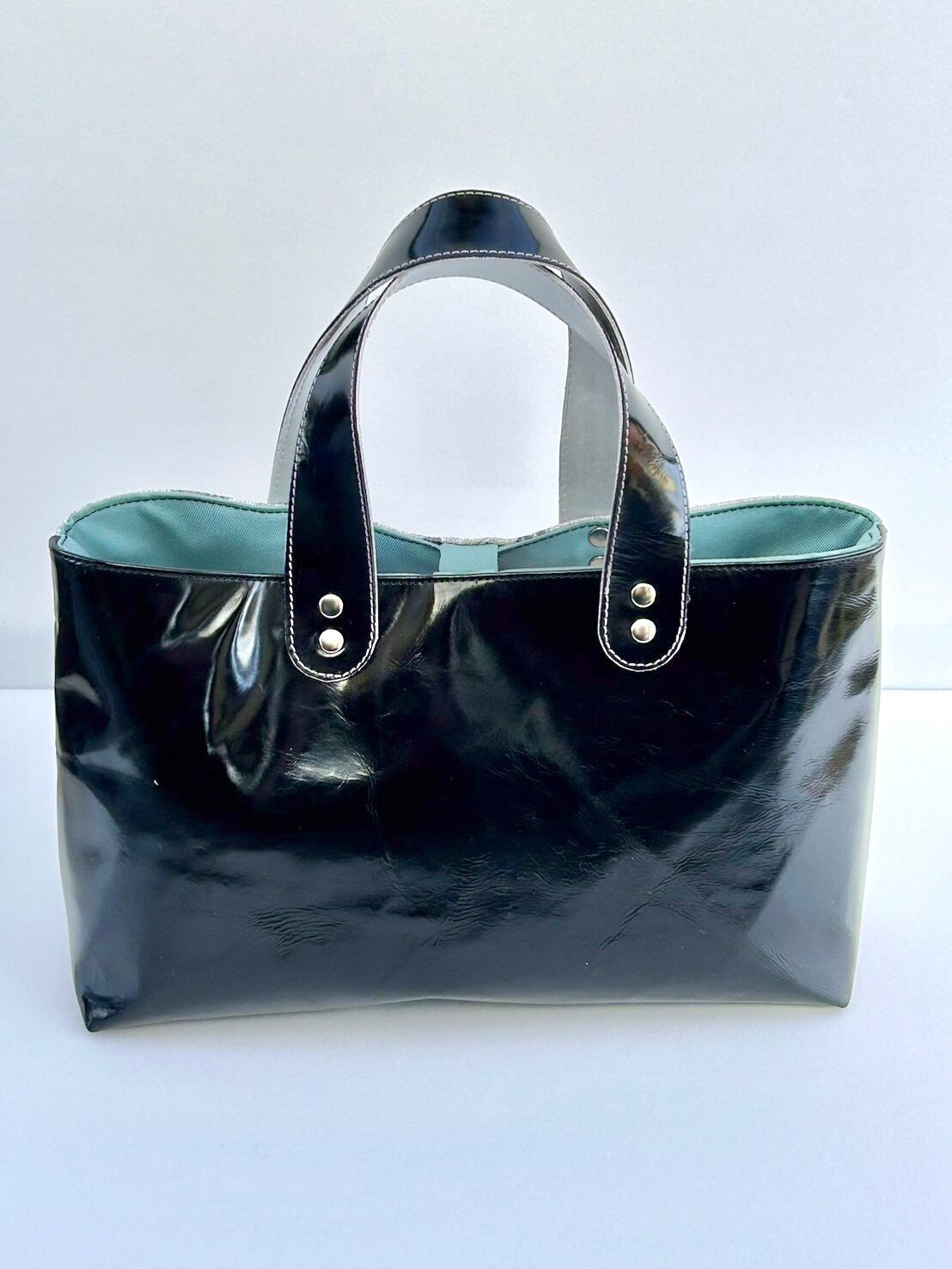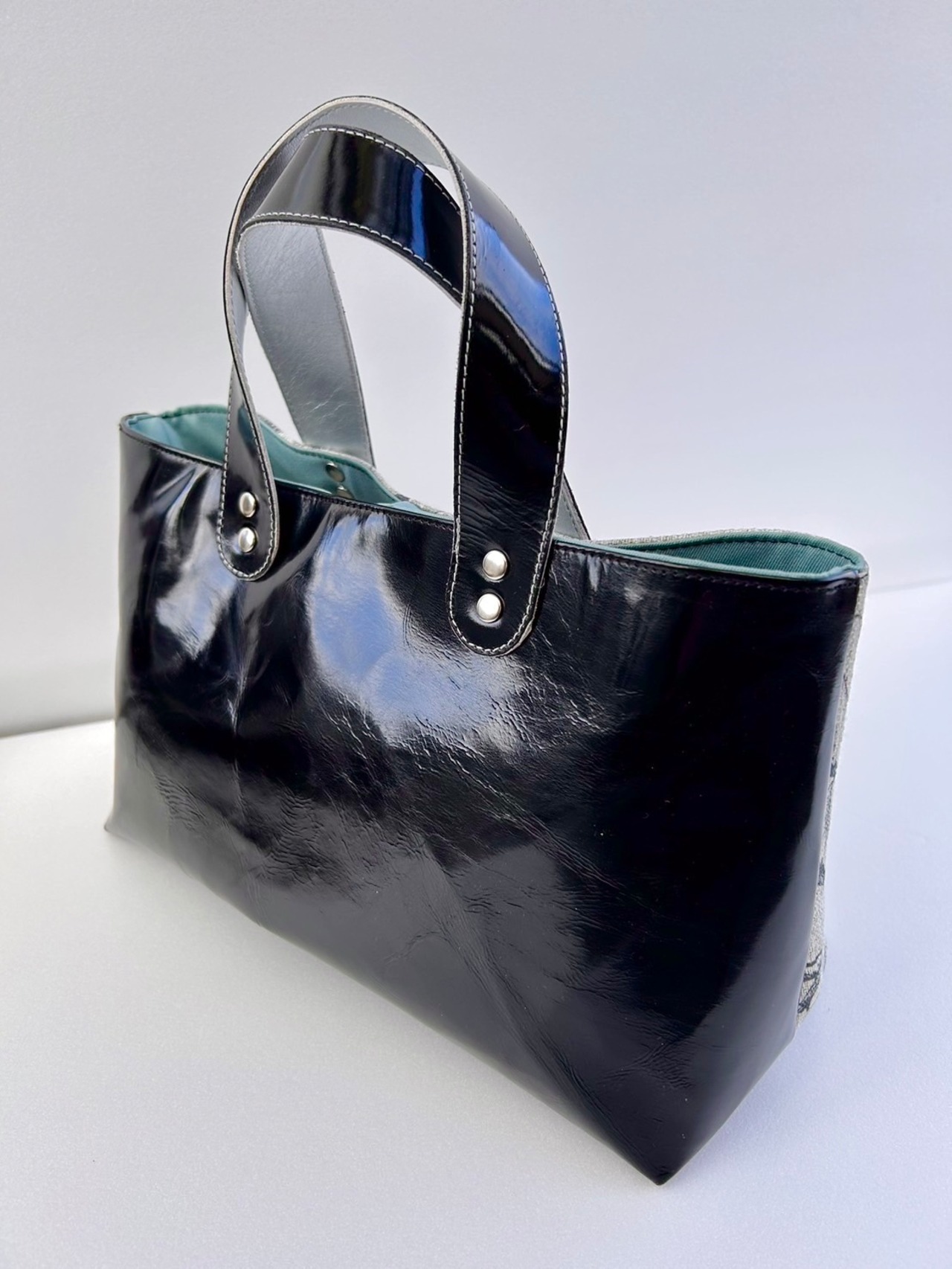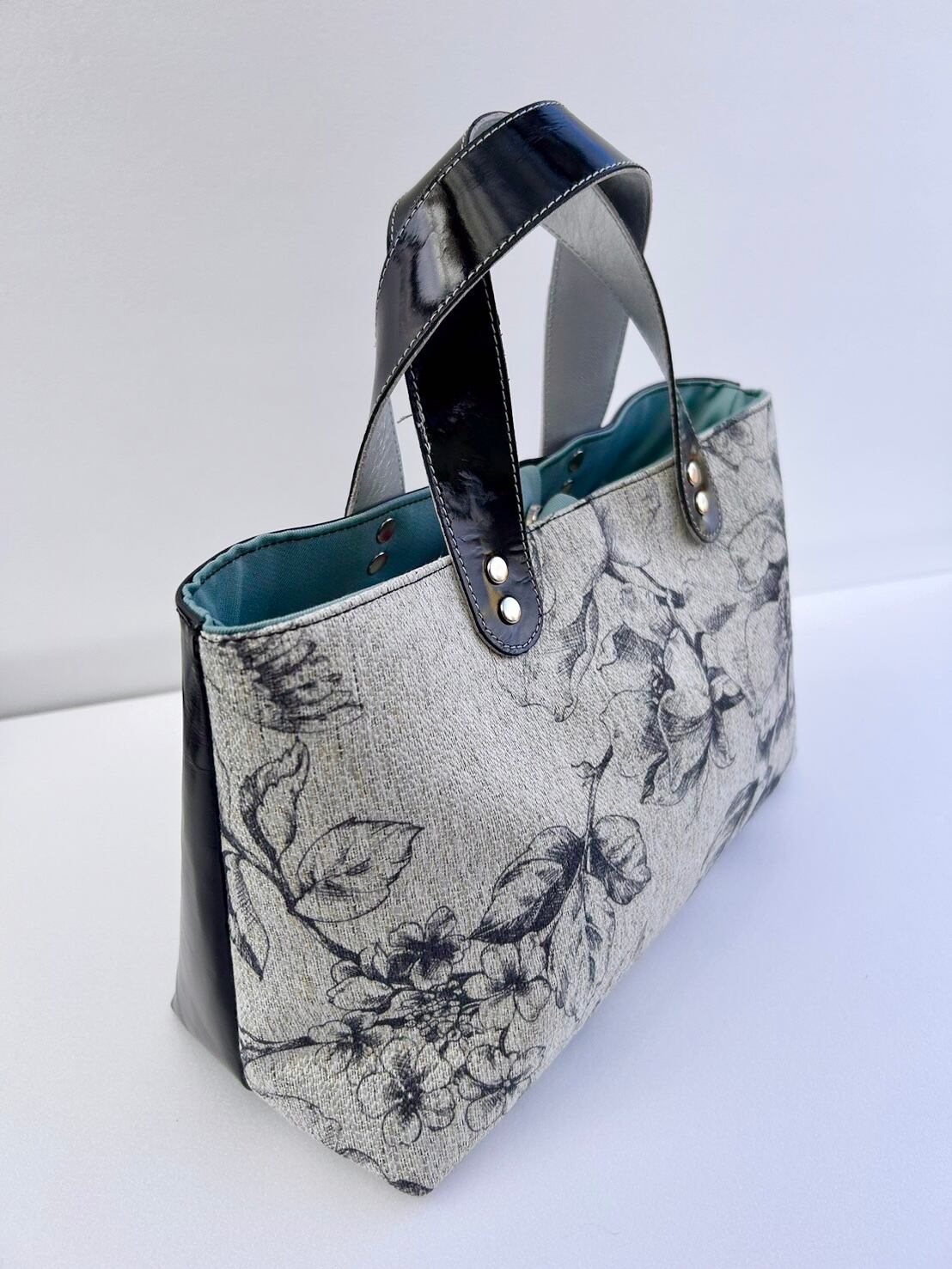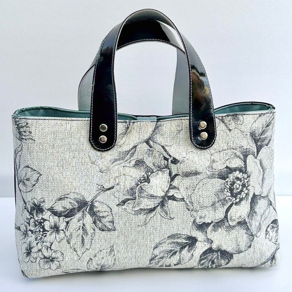 エナメル加工された本革の光沢が素敵な花柄ハンドバッグです。
