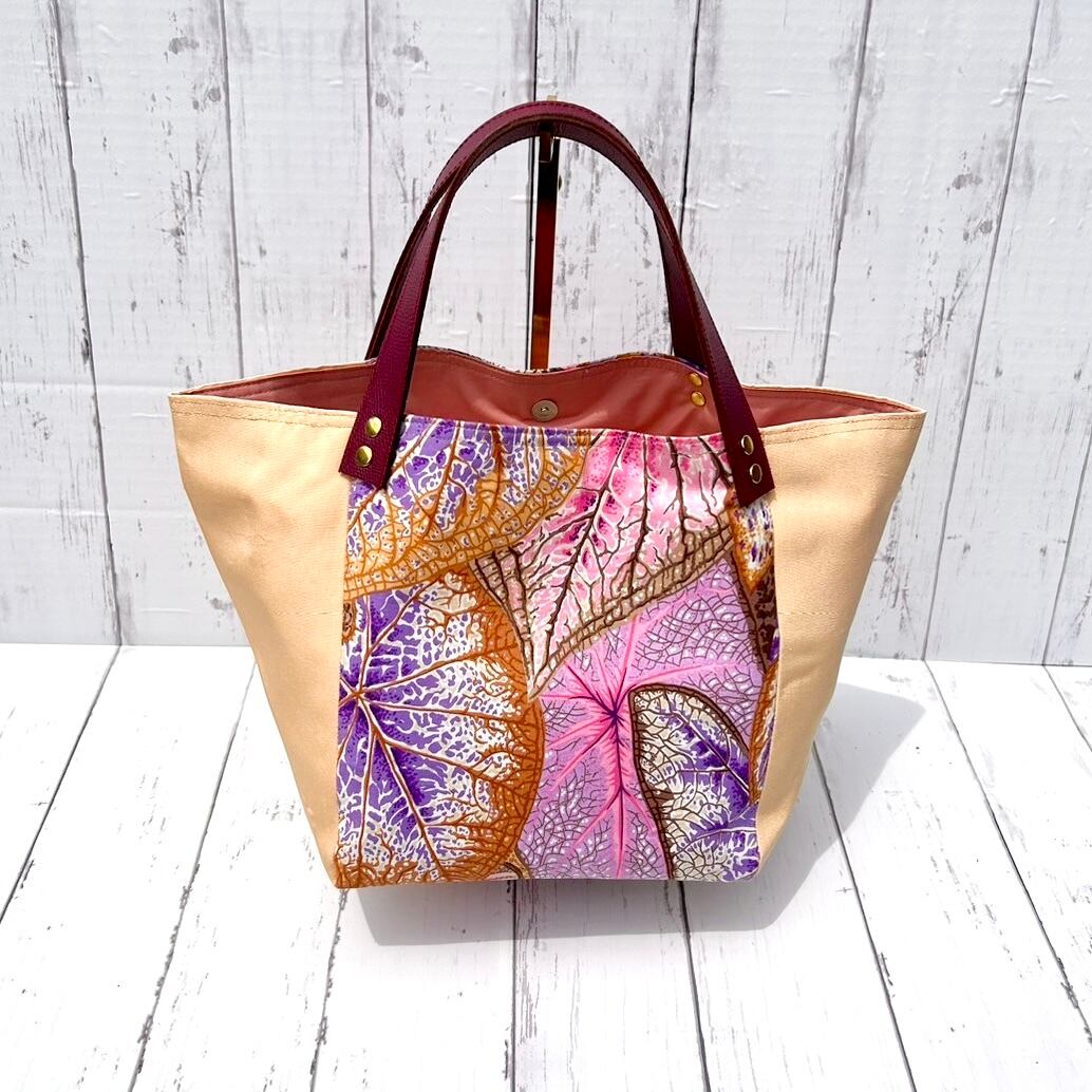 優雅なクリーム色の着物の帯を使用したハンドバッグ。独特の葉脈の模様が、どんなシーンにも華やかさをプラスする魅力的なデザインです!洋装和装まで、幅広いスタイルに対応できるアイテムです。