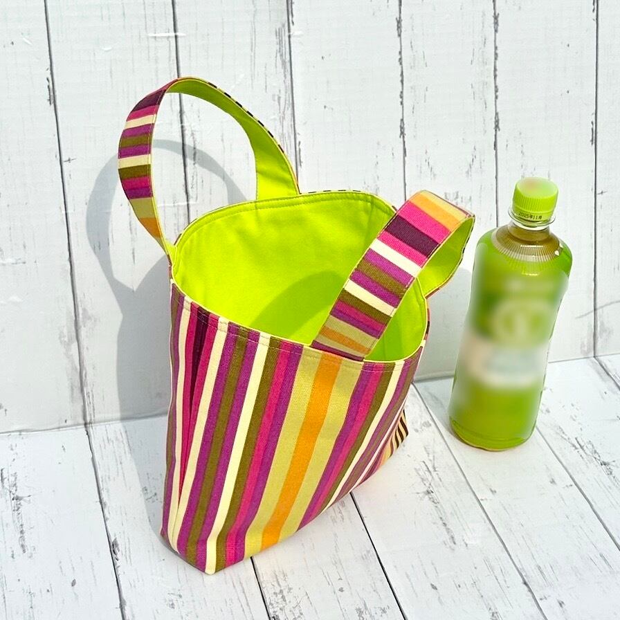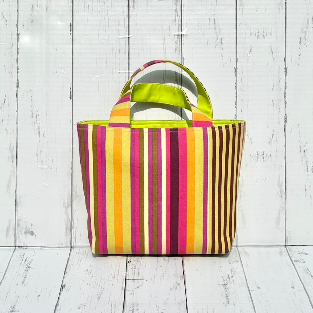 カラフルストライプが目を引く、元気いっぱいのトートバッグです♪仏生地を使用したこのバッグは、鮮やかなストライプ柄が特徴で、日常使いはもちろん、特別な日にもぴったりです。