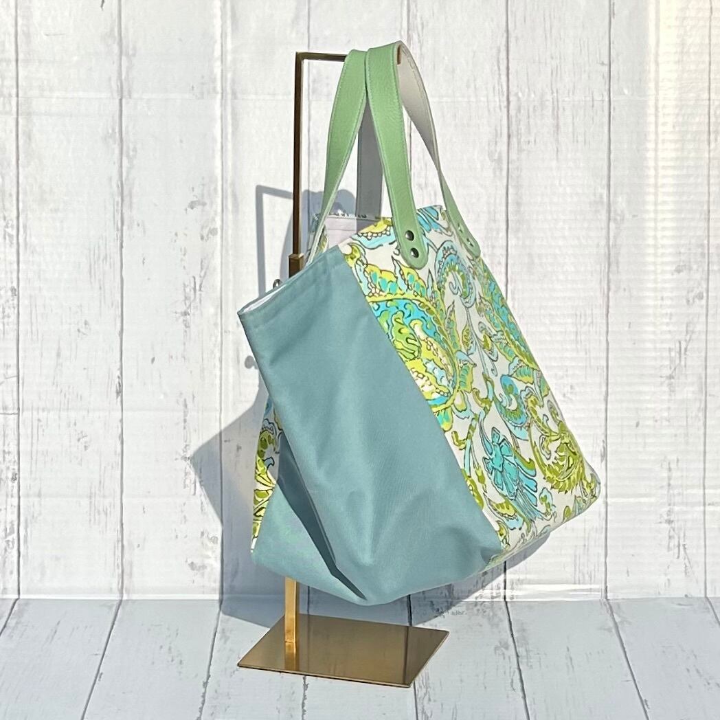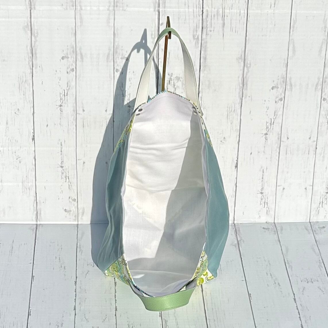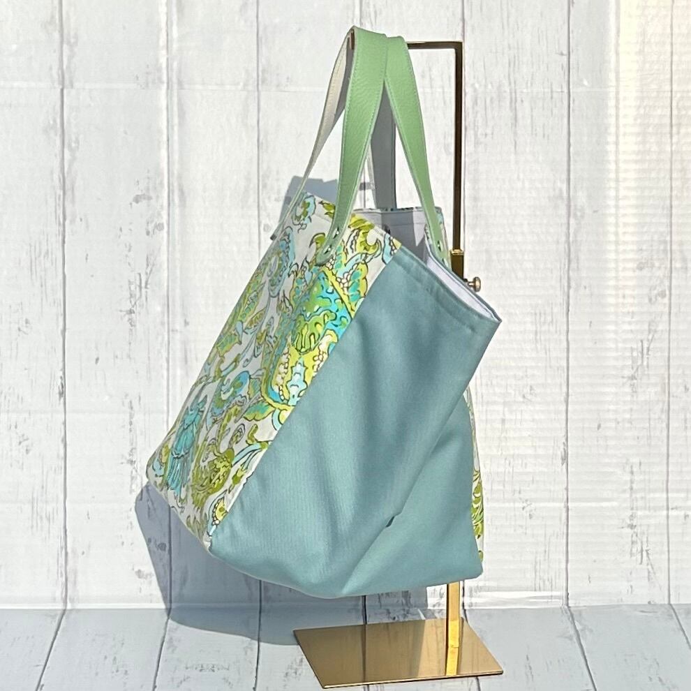 爽やかなブルーとライムグリーンが映えるフローラルリーフ柄のバッグ。