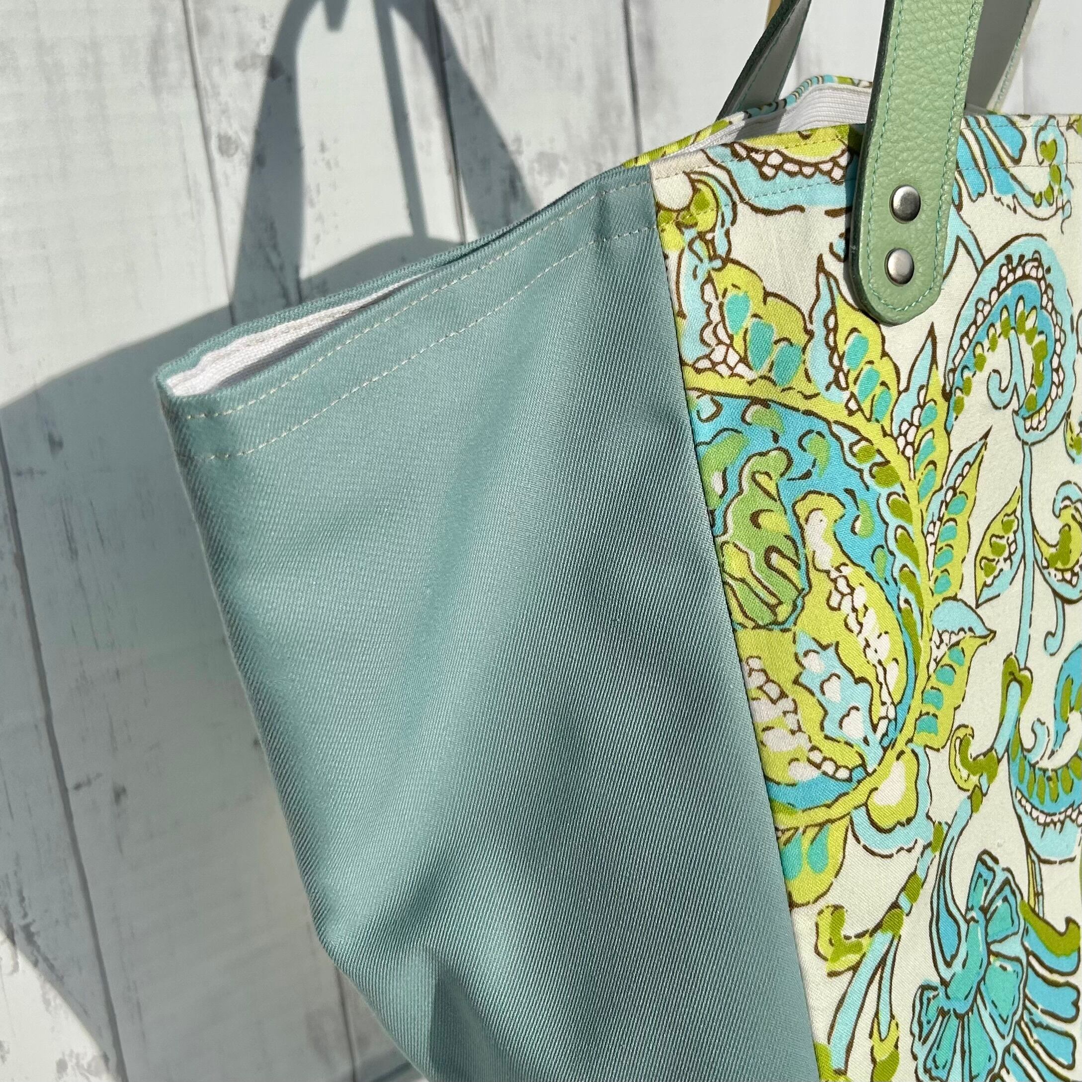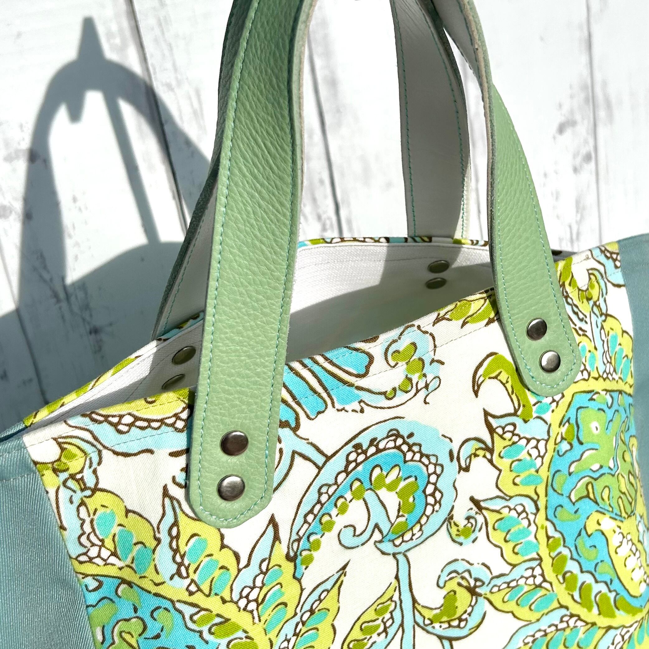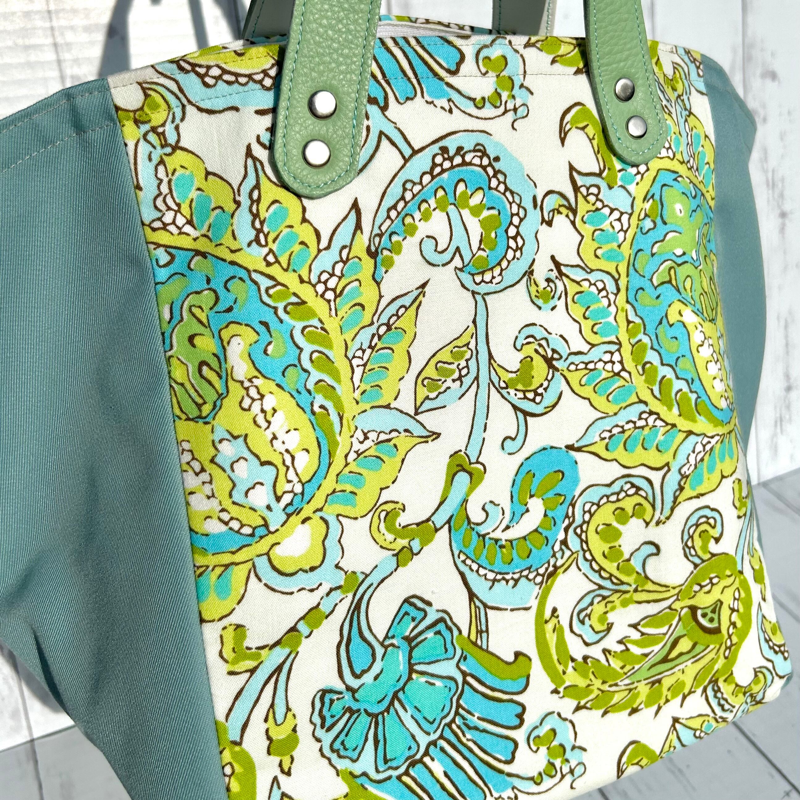 爽やかなブルーとライムグリーンが映えるフローラルリーフ柄のバッグ。
