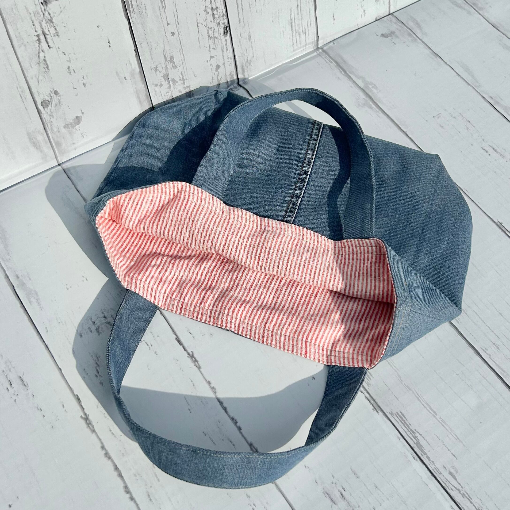 デニム生地とオレンジのストライプがシンプルで可愛いミニバック。柔らかく折りたためるのでエコバッグとして持ち歩くのにもおすすめです。