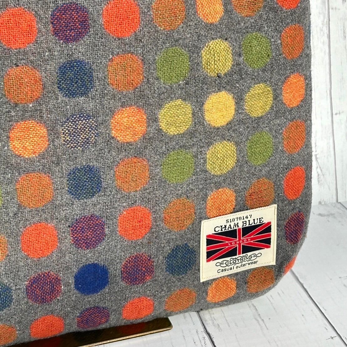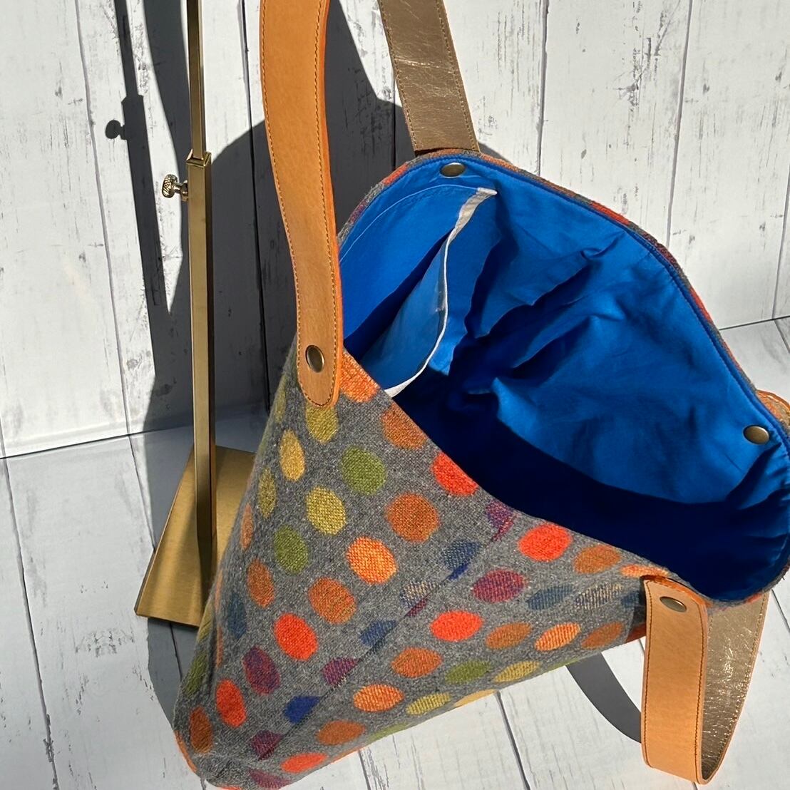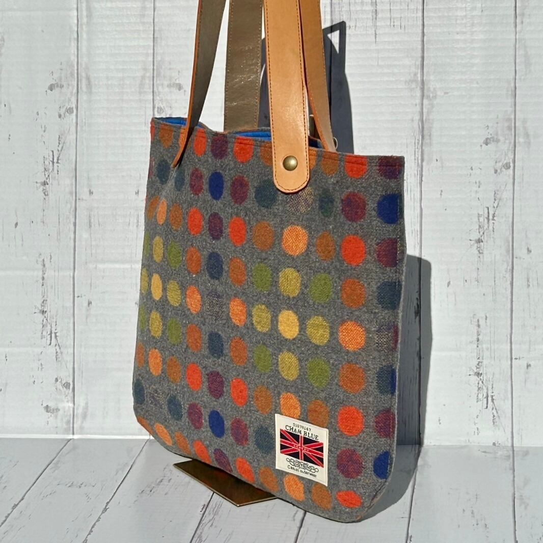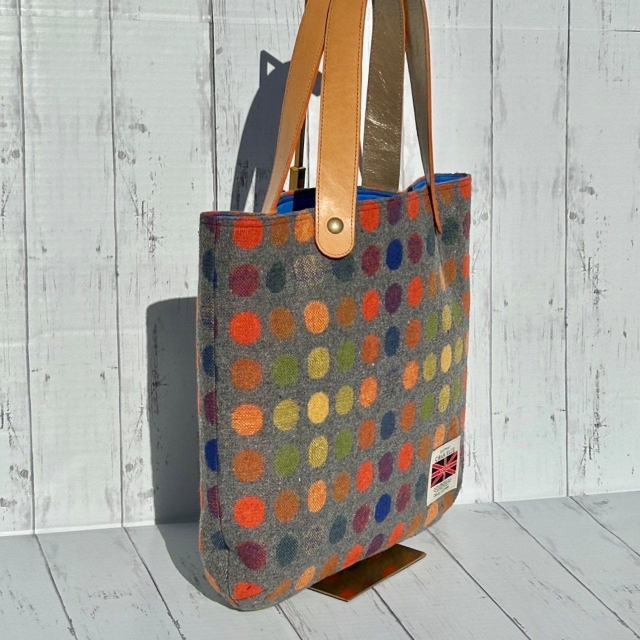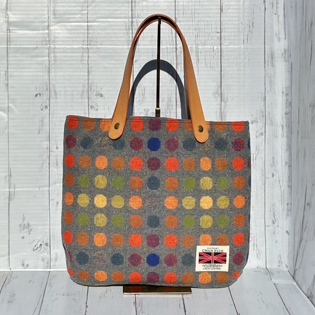 カラフルなマルチカラーのドット柄が目を引く、ウール調素材のトートバッグ。