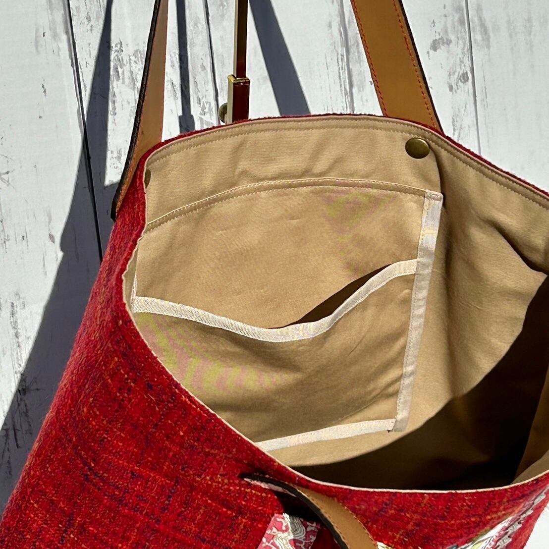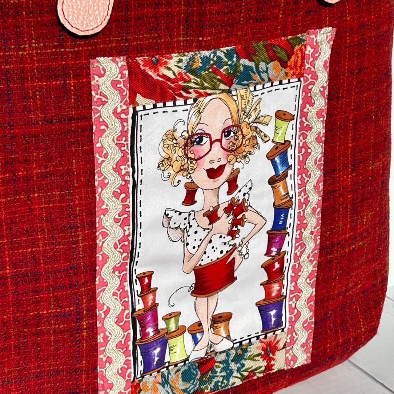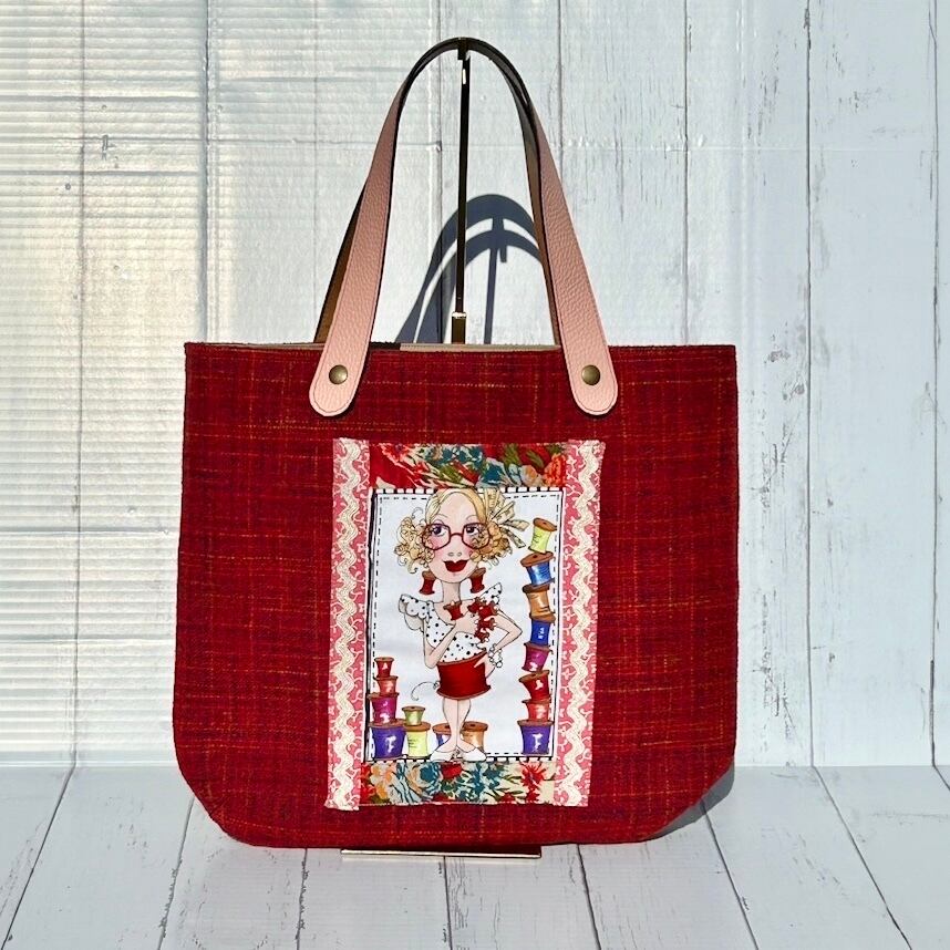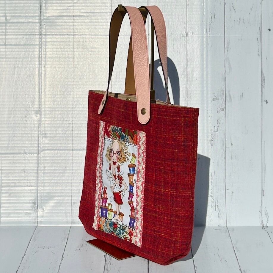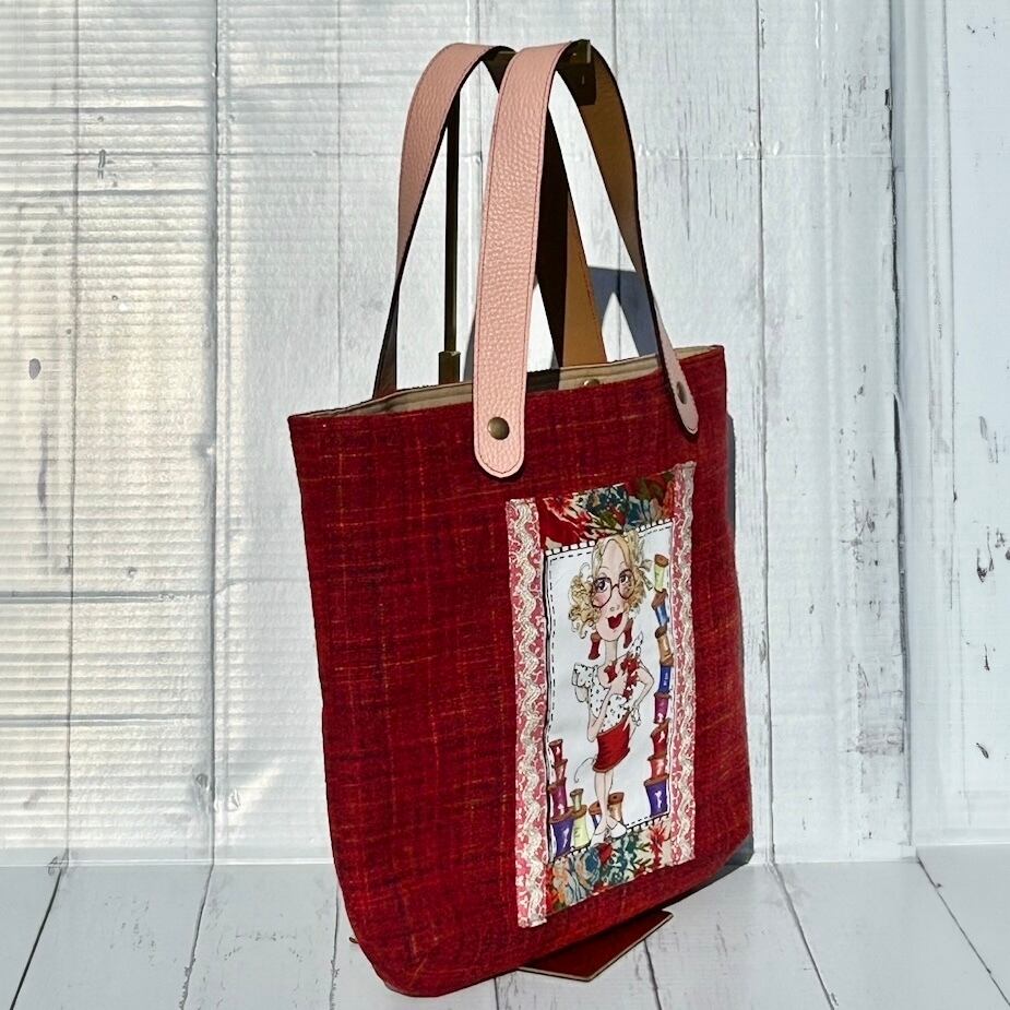 深みのあるルージュレッドの生地に、ロラライハリスが目を引く、遊び心あふれるトートバッグです。
