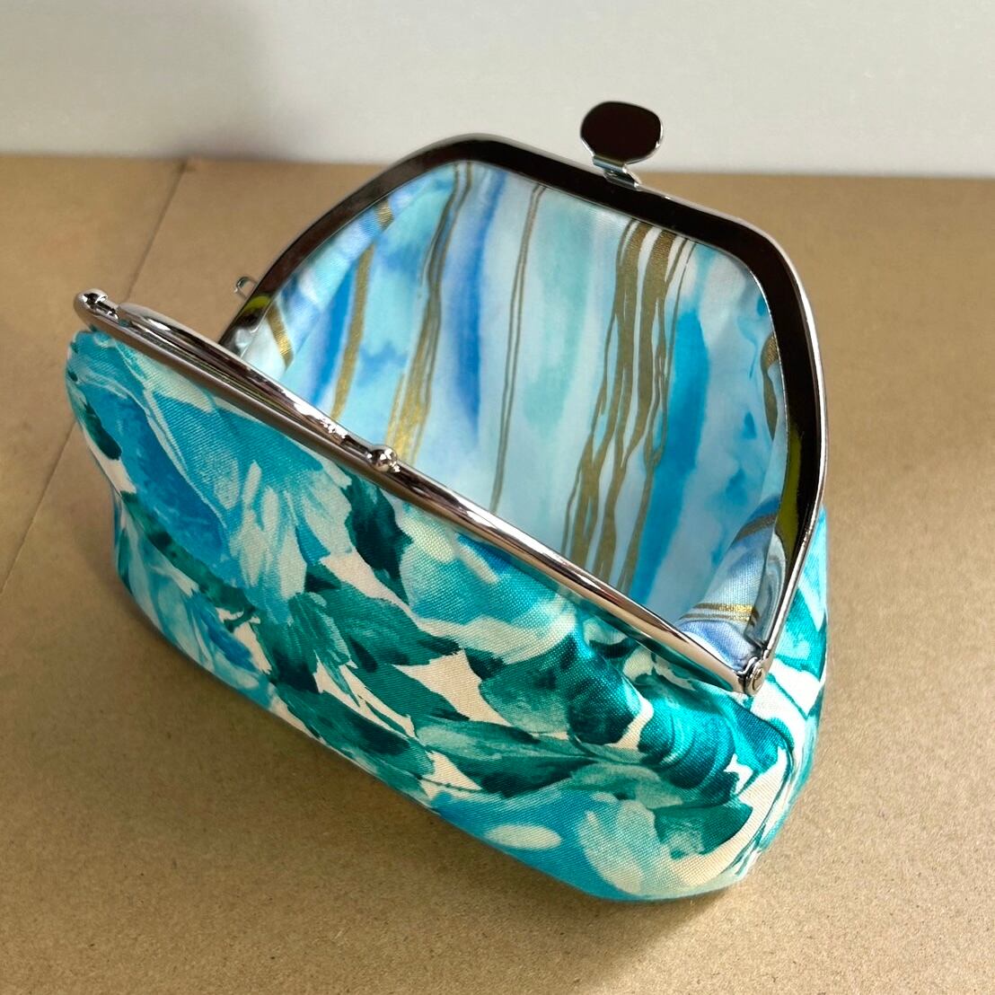 ブルーローズが美しいおしゃれながま口ポーチ。